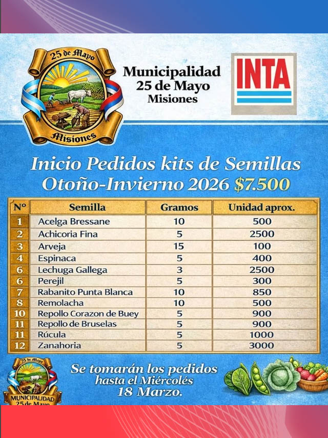 AGENCIA MISIONES.UNO | La Secretaría del Agro y la Producción de la Municipalidad de 25 de Mayo informó que se encuentra abierta la recepción de pedidos de los Kits de Semillas Otoño–Invierno 2026, con un valor de $7.500 por unidad y modalidad de pago adelantado presencial.