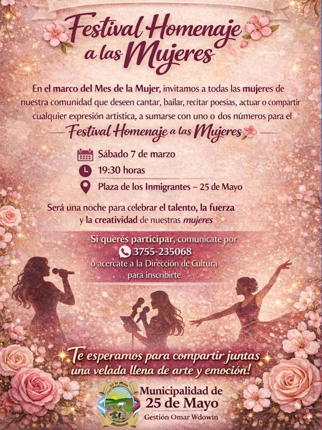 AGENCIA MISIONES.UNO | En el marco del Mes de la Mujer, la Municipalidad de 25 de Mayo convoca a participar del Festival Homenaje a las Mujeres, que se realizará el sábado 7 de marzo a las 19:30 en la Plaza de los Inmigrantes.