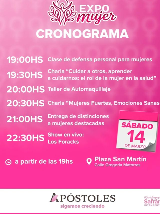 AGENCIA MISIONES.UNO | Este sábado 14 de marzo se realizará la Expo Mujer en la ciudad de Apóstoles, una propuesta destinada a destacar el talento, el trabajo y el compromiso de las mujeres de la comunidad a través de diversas actividades culturales, productivas y recreativas.