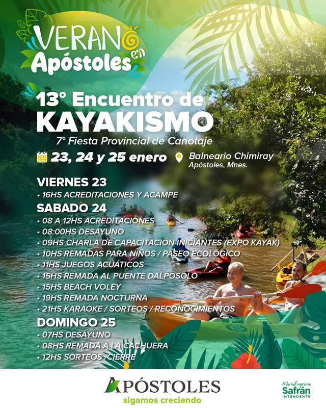 AGENCIA MISIONES.UNO | La Municipalidad de Apóstoles dio a conocer el programa de actividades del 13° Encuentro de Kayakismo y la 7° Fiesta Provincial de Canotaje, que se desarrollarán del 23 al 25 de enero en el balneario Chimiray, en el marco de las propuestas de Verano en Apóstoles.