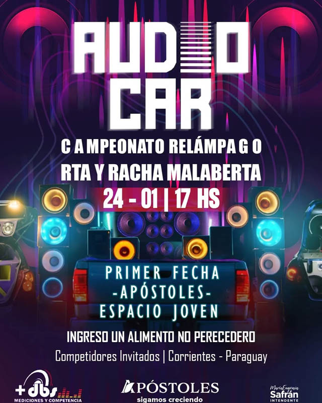 AGENCIA MISIONES.UNO | La ciudad de Apóstoles recibirá este sábado 24 de enero la primera fecha del Campeonato Relámpago de Audio Car, que se desarrollará desde las 17 horas en el Espacio Joven.