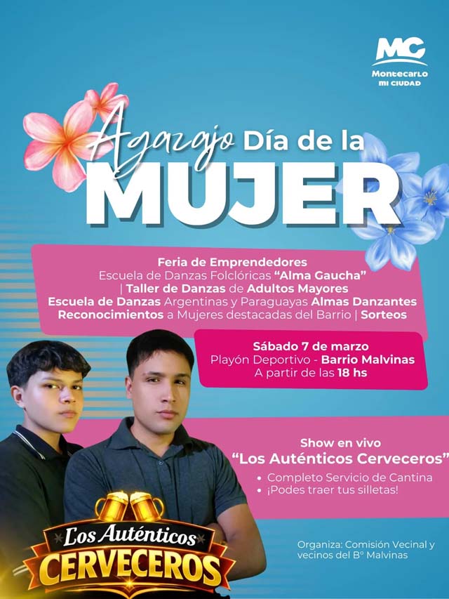 AGENCIA MISIONES.UNO | El barrio Malvinas de Montecarlo se prepara para conmemorar el Día de la Mujer con un evento que se realizará este sábado 7 de marzo desde las 18 en el playón deportivo, con propuestas culturales, feria de emprendedores y reconocimientos a mujeres destacadas de la comunidad.