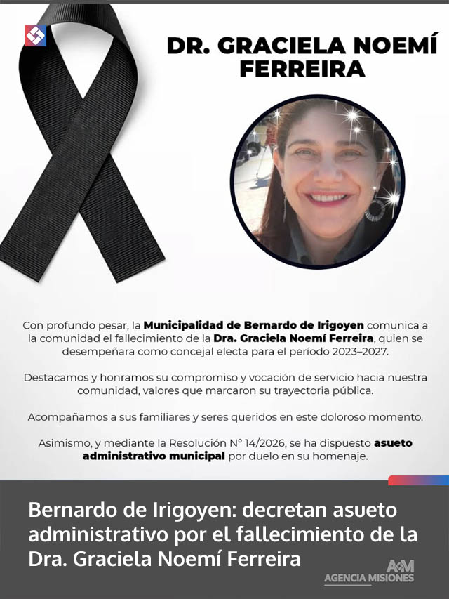 Bernardo de Irigoyen: decretan asueto administrativo por el fallecimiento de la Dra. Graciela Noemí Ferreira