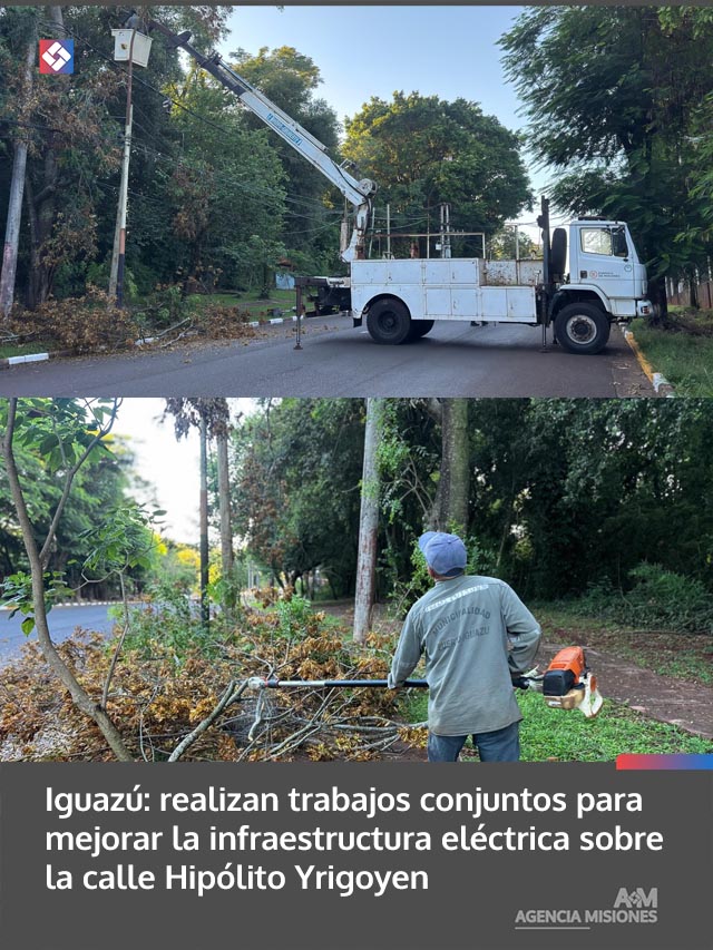 Iguazú: realizan trabajos conjuntos para mejorar la infraestructura eléctrica sobre la calle Hipólito Yrigoyen
