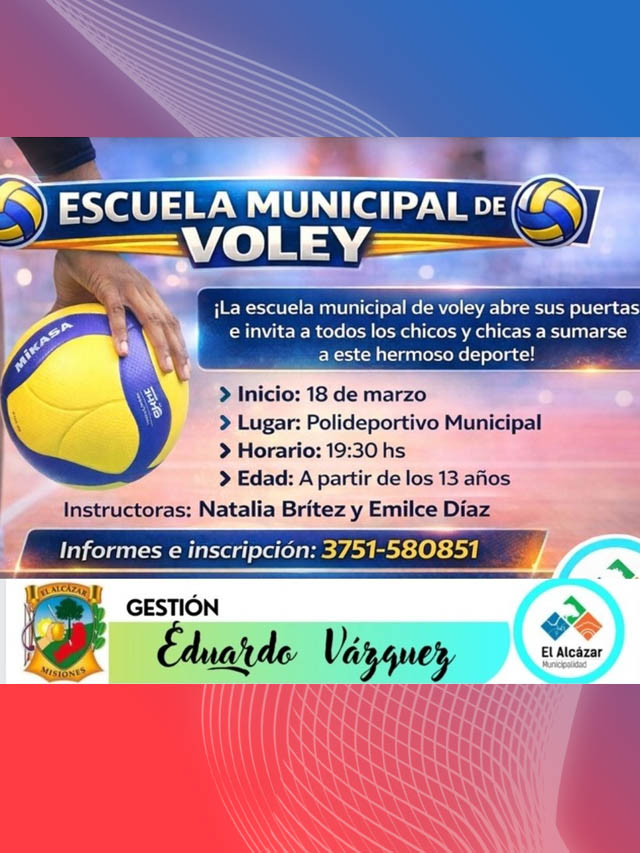 AGENCIA MISIONES.UNO | La Municipalidad de El Alcázar informó que la Escuela Municipal de Vóley comenzará sus actividades el próximo 18 de marzo en el Polideportivo Municipal, invitando a chicos y chicas a sumarse a la propuesta deportiva.