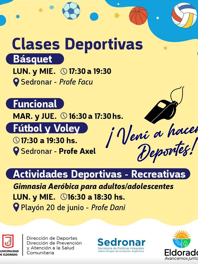 Las actividades incluyen básquet, entrenamiento funcional, fútbol, vóley y gimnasia aeróbica, todas coordinadas por profesores a cargo. La iniciativa busca generar espacios de participación que promuevan la actividad física y el encuentro entre vecinos a través del deporte.