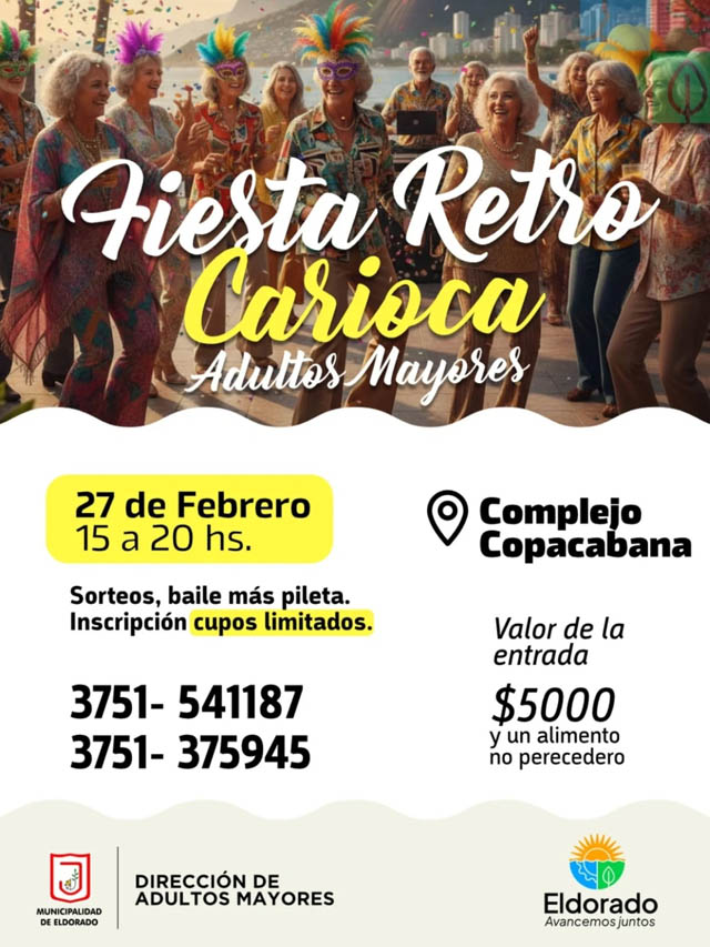 AGENCIA MISIONES.UNO | La Municipalidad de Eldorado anunció la realización de la Fiesta Retro Carioca destinada a Adultos Mayores, que se llevará a cabo el próximo 27 de febrero en el Complejo Copacabana.