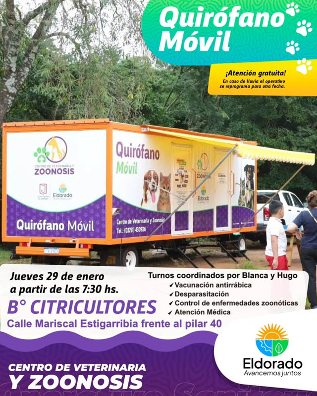 AGENCIA MISIONES.UNO | La Municipalidad de Eldorado anunció un nuevo operativo de esterilización de mascotas a través del Quirófano Veterinario Móvil, impulsado por el Centro de Veterinaria y Zoonosis de la ciudad.