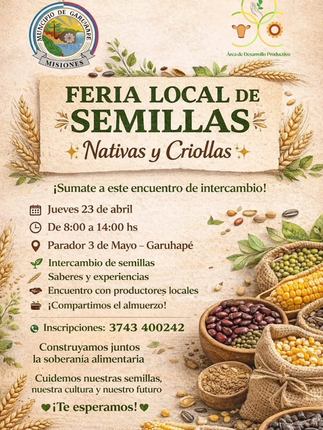AGENCIA MISIONES.UNO | La Municipalidad de Garuhapé invita a participar de la Feria Local de Semillas “Nativas y Criollas”, un espacio de intercambio y encuentro entre productores que se realizará el 23 de abril.