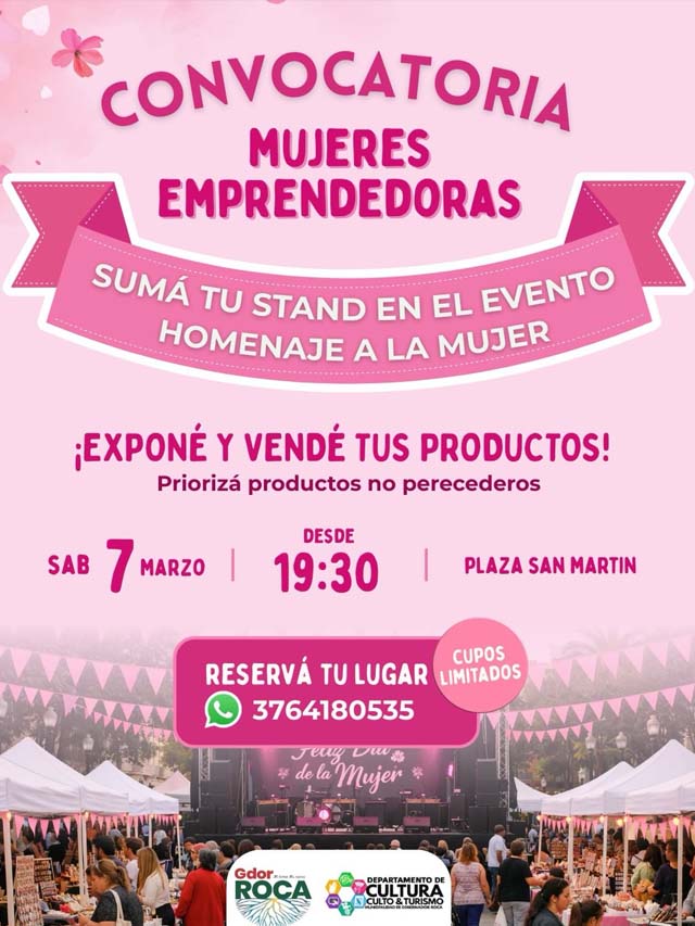 En el marco de las actividades por el Mes de la Mujer, en Gobernador Roca se lanzó una convocatoria destinada a mujeres emprendedoras que deseen formar parte de un evento homenaje donde podrán exhibir y comercializar sus productos.