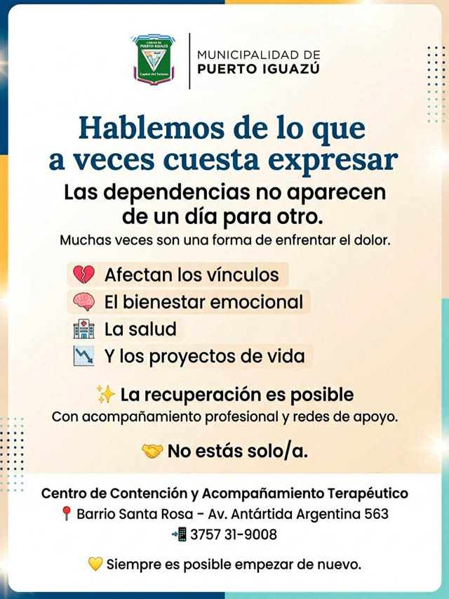 Desde el Centro de Contención y Acompañamiento Terapéutico destacaron que detrás de muchas situaciones complejas existen historias que requieren ser atendidas de manera integral, entendiendo que las dependencias pueden afectar profundamente la vida cotidiana.