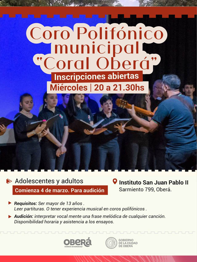 En tanto, el Coro Polifónico Municipal “Coral Oberá” iniciará el 4 de marzo, con ensayos los miércoles de 20 a 21.30 horas en el Instituto San Juan Pablo III (Sarmiento 799). Está destinado a mayores de 13 años que sepan leer partituras o cuenten con experiencia coral, y contempla una audición vocal.