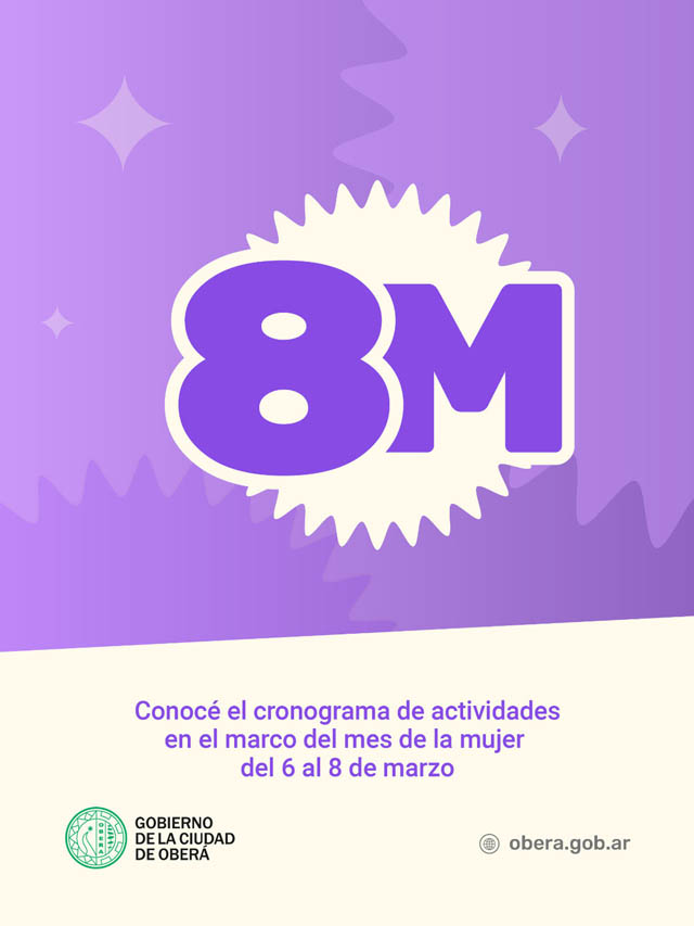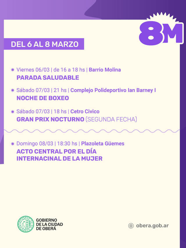 AGENCIA MISIONES.UNO | El Gobierno de la Ciudad de Oberá invita a la comunidad a participar de las propuestas organizadas del 6 al 8 de marzo, con iniciativas vinculadas a la salud, el deporte y la concientización en distintos puntos de la ciudad.