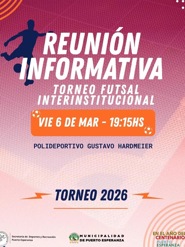 AGENCIA MISIONES.UNO | En Puerto Esperanza se realizará una reunión informativa destinada a instituciones interesadas en participar del Torneo Interinstitucional de Futsal, con el objetivo de coordinar aspectos organizativos y brindar detalles sobre la competencia.