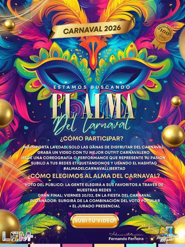 AGENCIA MISIONES.UNO | La Municipalidad de Puerto Libertad presentó el concurso “El Alma del Carnaval”, una propuesta abierta a toda la comunidad para elegir a quien mejor represente el espíritu y la pasión de la fiesta popular en la localidad.