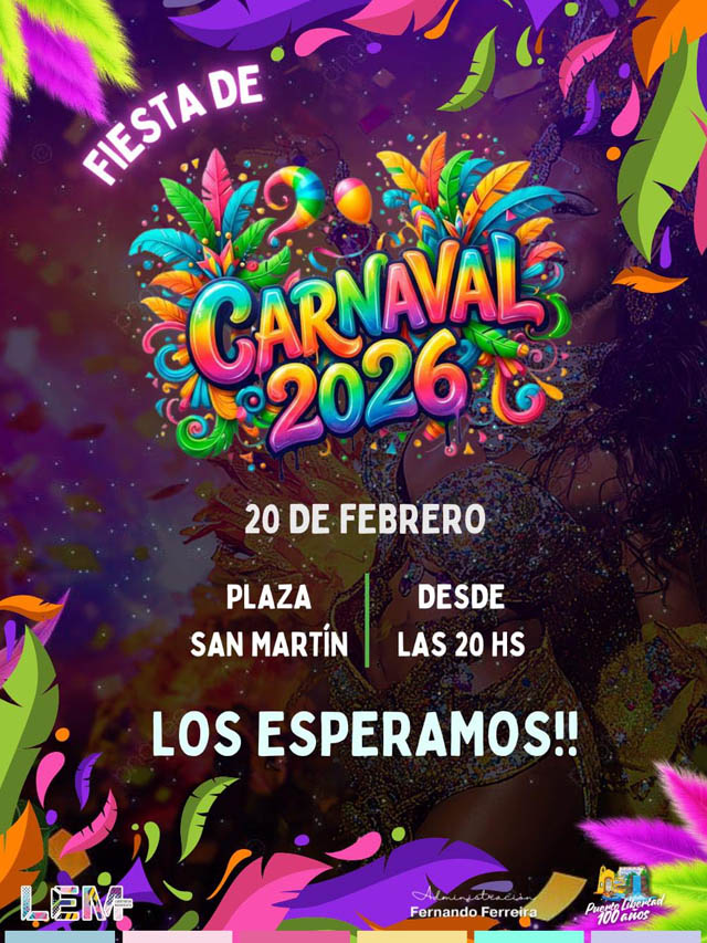 AGENCIA MISIONES.UNO | La Municipalidad de Puerto Libertad informó que la Fiesta de Carnaval fue reprogramada para el viernes 20 de febrero, desde las 20:00 horas, en la Plaza San Martín, tras las condiciones climáticas que impidieron su realización en la fecha prevista inicialmente.