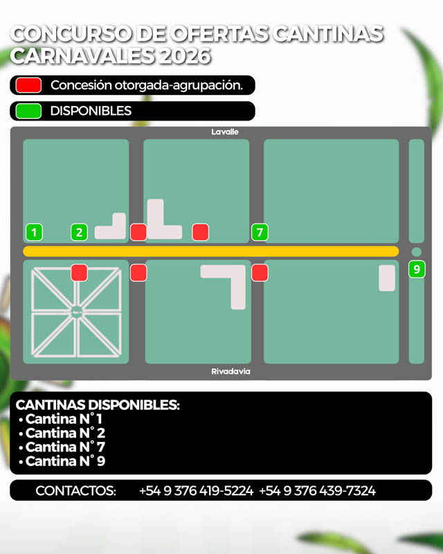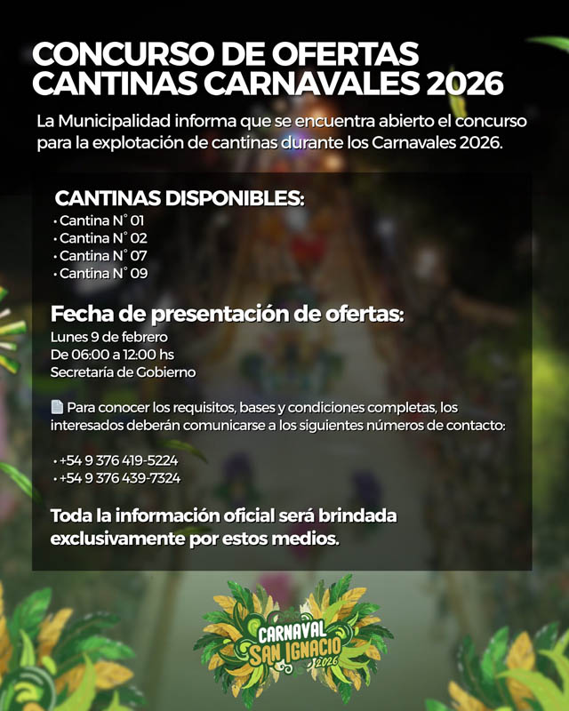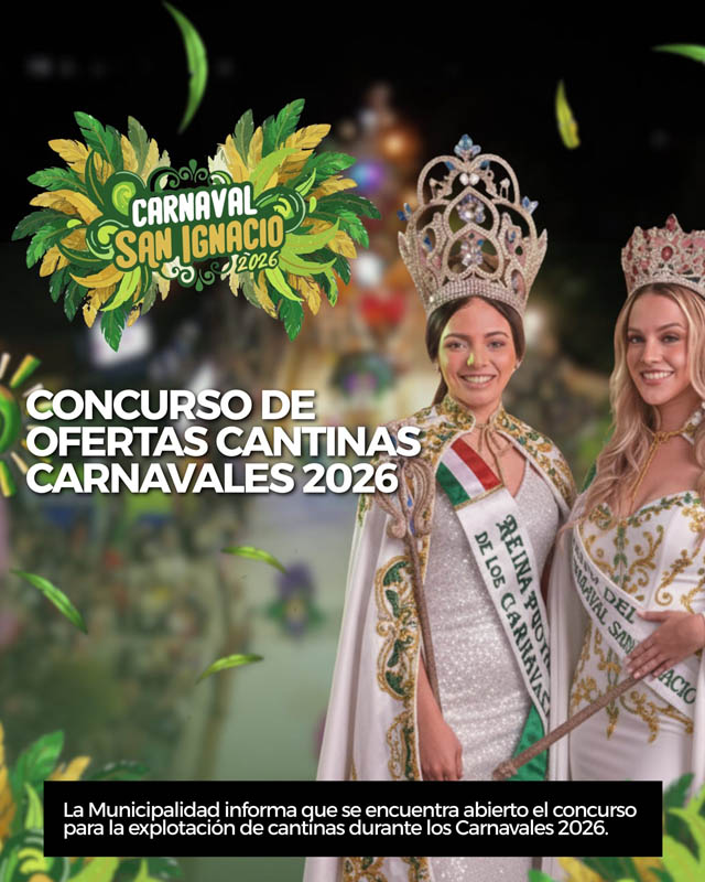AGENCIA MISIONES.UNO | La Municipalidad de San Ignacio informó que se encuentra abierta la convocatoria para la explotación de cantinas durante la edición 2026 de los carnavales, destinada a interesados en participar del tradicional evento.