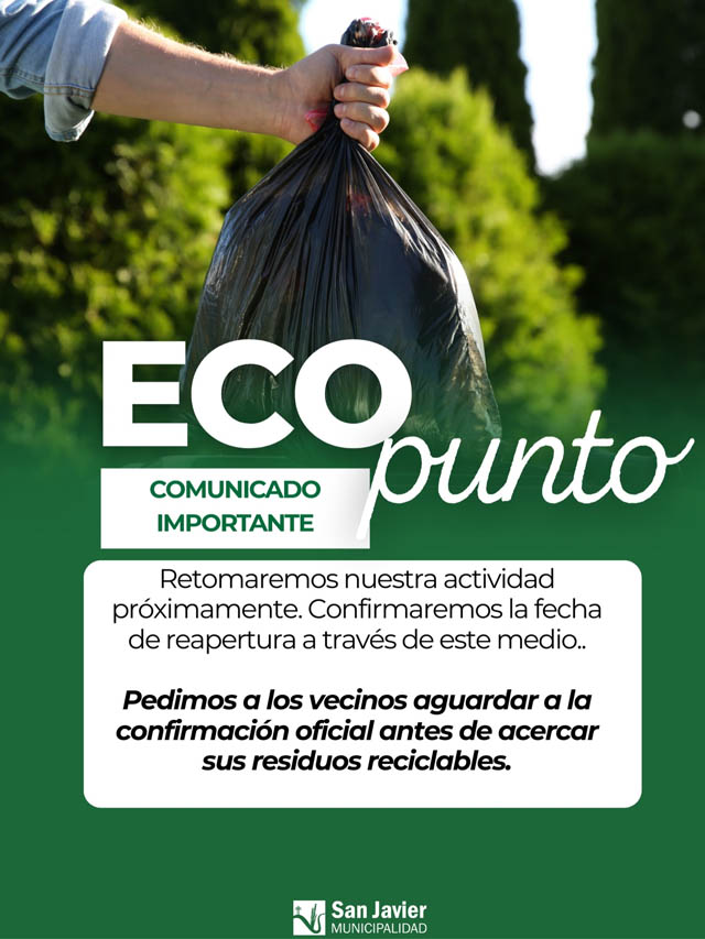 AGENCIA MISIONES.UNO | La Municipalidad de San Javier informó que el Eco Punto retomará sus actividades en los próximos días y que la fecha oficial de reapertura será comunicada a través de los canales habituales del municipio.