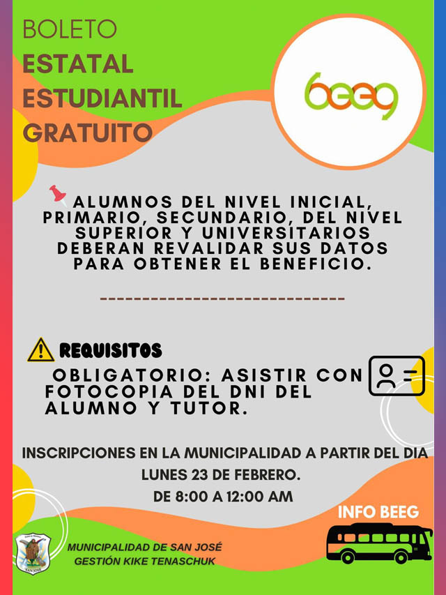 AGENCIA MISIONES.UNO | La Municipalidad de San José informó que los alumnos de todos los niveles educativos deberán revalidar sus datos para poder acceder al beneficio del Boleto Estatal Estudiantil Gratuito.