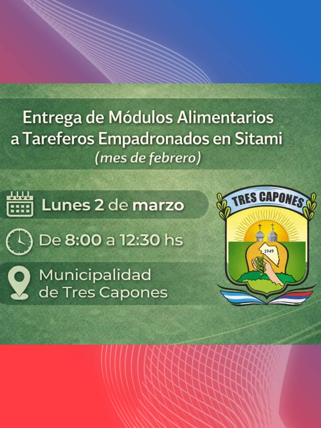 AGENCIA MISIONES.UNO | La Municipalidad de Tres Capones informó que el lunes 2 de marzo se realizará la entrega de módulos alimentarios destinados a tareferos empadronados en el Sistema de Información de Tareferos de Misiones (SITAMI).