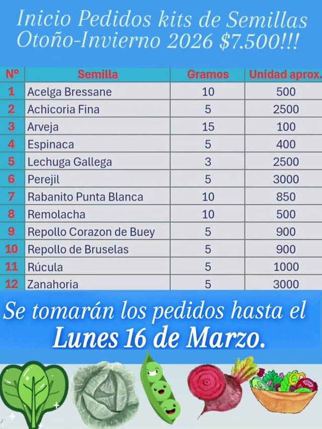 AGENCIA MISIONES.UNO | La Municipalidad de Tres Capones informó que se encuentran disponibles los pedidos del Kit de Semillas Otoño–Invierno 2026, destinados a vecinos interesados en preparar su huerta para la próxima temporada.