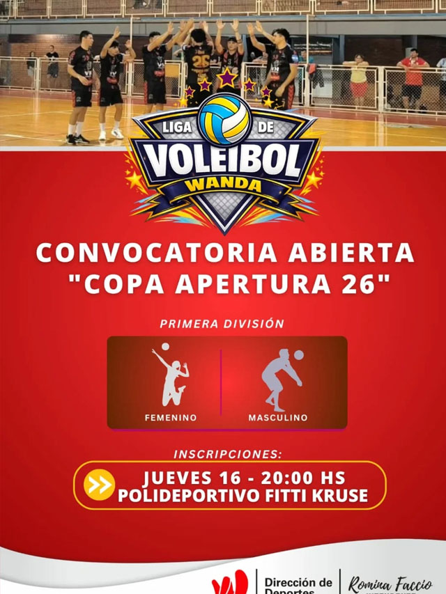 AGENCIA MISIONES.UNO | La Dirección de Deportes de Wanda informó que ya se encuentran abiertas las inscripciones para participar de la Copa Apertura 2026 de vóley en la localidad.
